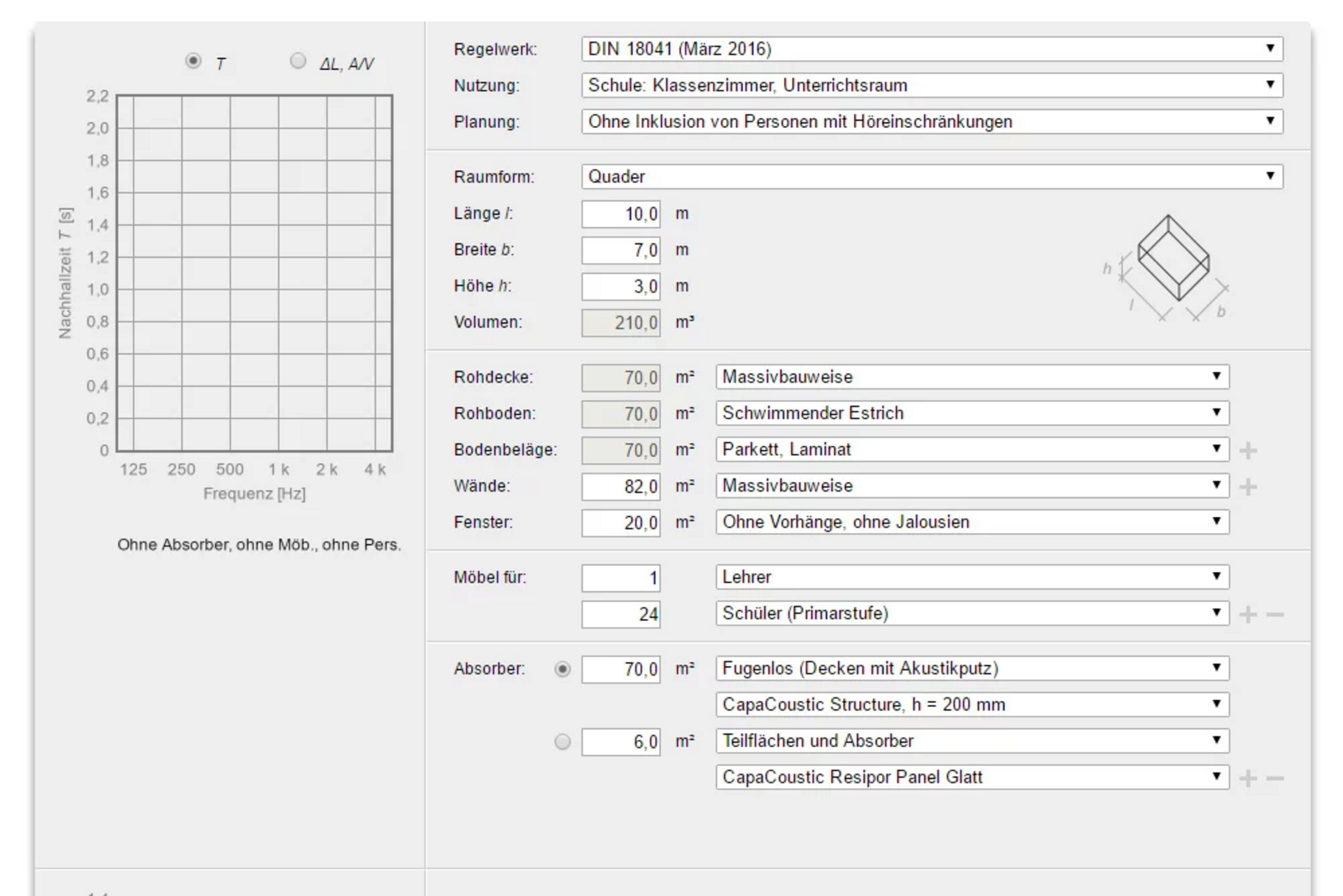 Mit dem Raum-Akustikrechner steht Ihnen ein Online-Programm zur Verfügung, das Ihnen schnell und unkompliziert ermöglicht, eine raumakustische Planung nach DIN 18041 (Hörsamkeit in kleinen bis mittelgroßen Räumen) für die jeweils geplante Raumnutzung vorzunehmen.