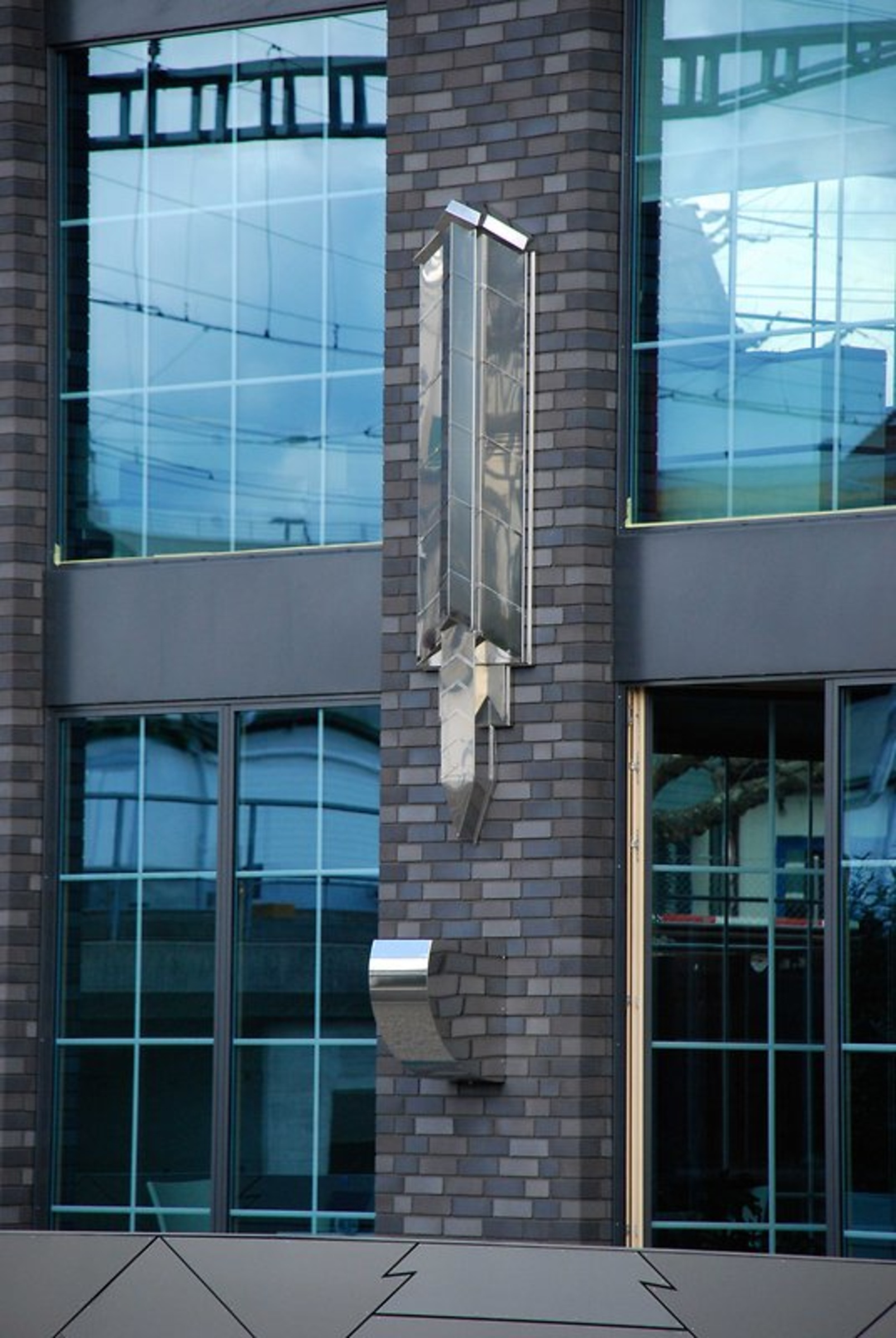 Ein markanter Pylon markiert den Eingangsbereich: In der Form eines Buchrückens mit Spiralfederbindung, einem Logo und dem Schriftzug „KRAFTWERK" zieht er die Blicke auf sich. Doch was dem gesamten Gebäude seine spezielle Ausstrahlung verleiht, ist die Klinkerfassade aus zufällig angeordneten, schwarzen, anthrazitfarbenen und grauen Steinen. Es sind keine massiven Klinkersteine – aber das fällt nicht einmal bei genauer Betrachtung auf – sondern schmale Flachverblender.