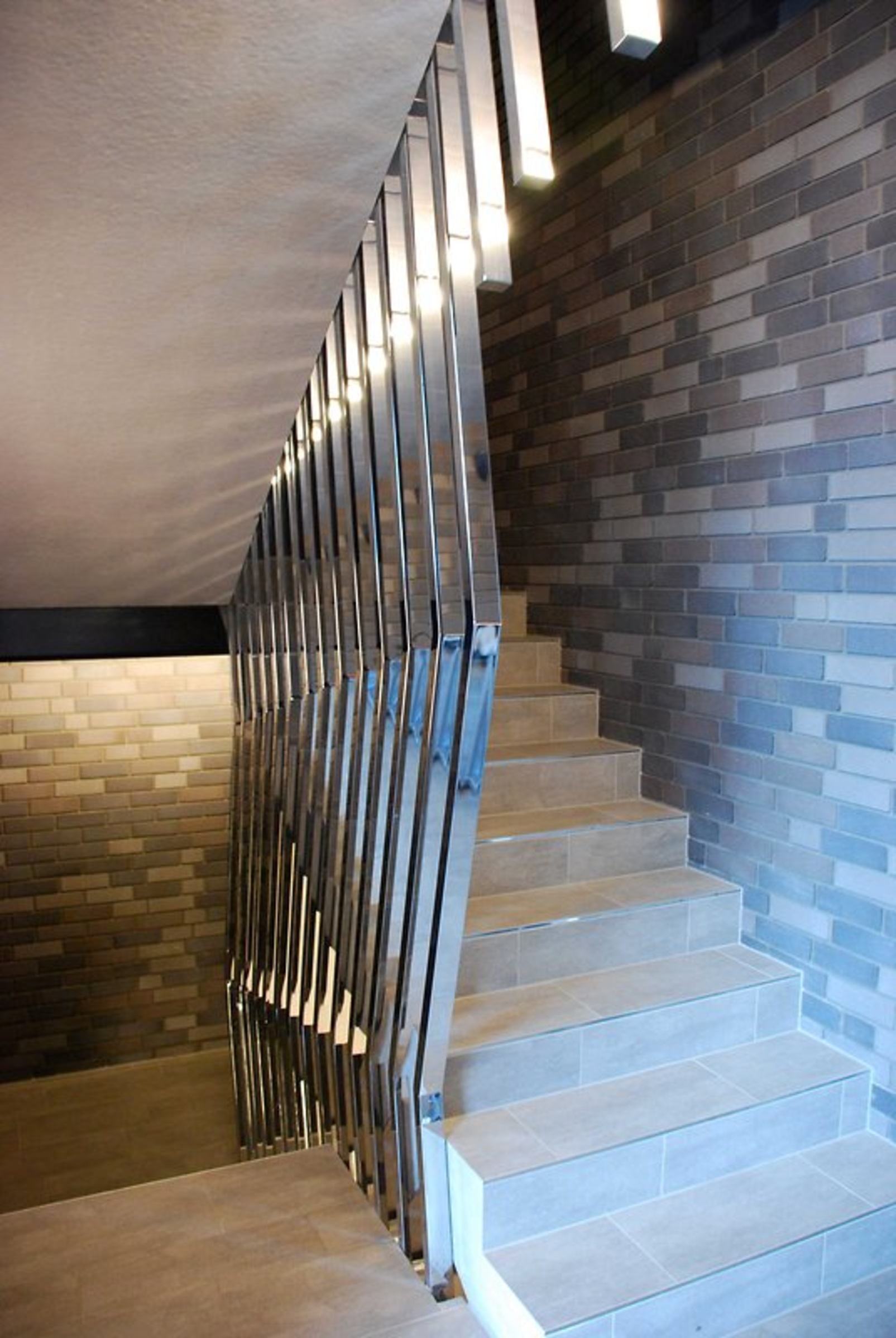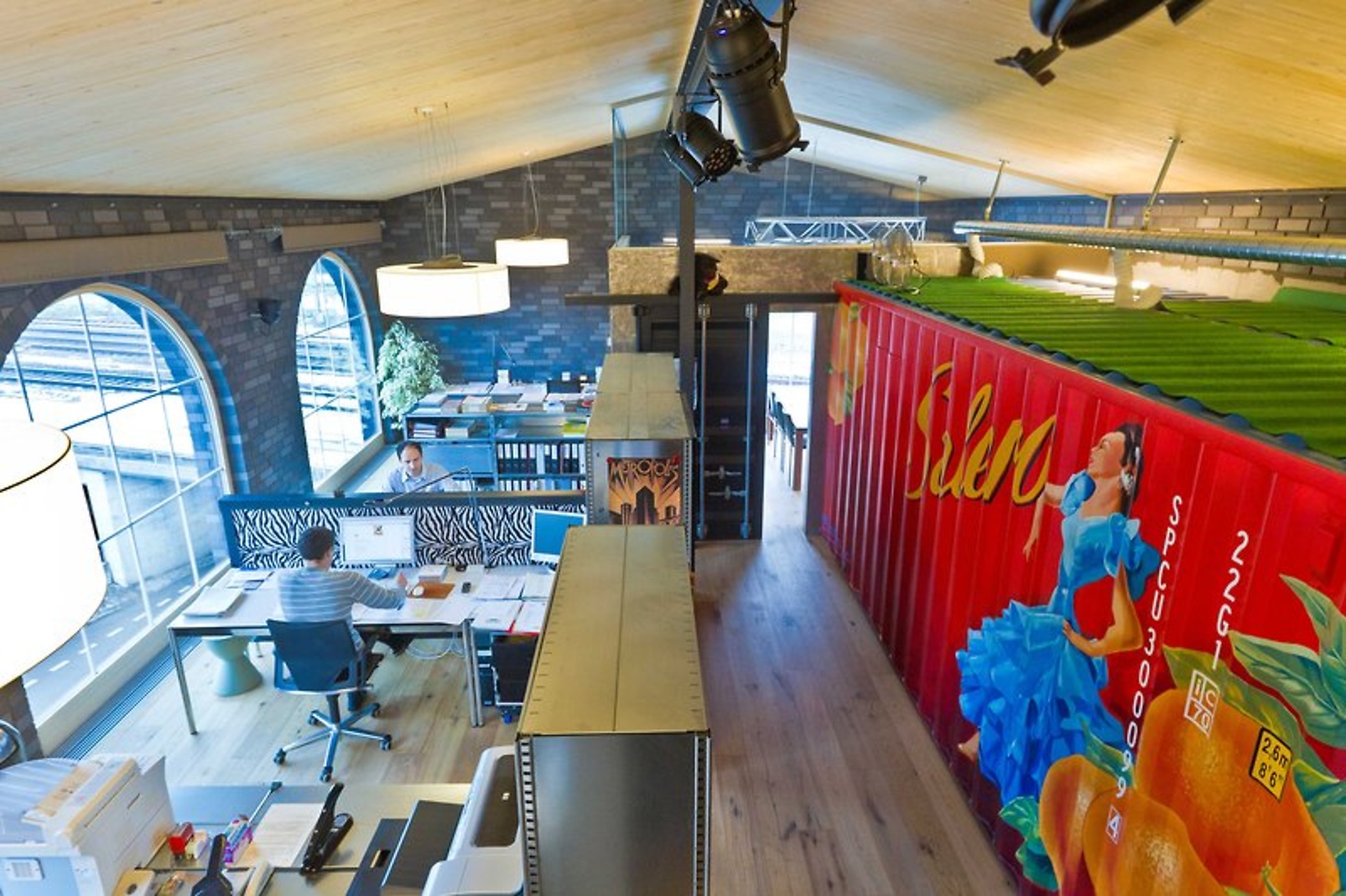 Die Meldorfer Flachverblender der Fassade wurden auch im Innenbereich als Gestaltungselement eingesetzt. Sie stehen im Kontrast zu dem farbenprächtigen Schiffscontainer aus Amerika, der als Raumteiler und Staufläche dient. Innen wurden die Klinker direkt auf den Stahlbeton geklebt, wodurch die Oberfläche auch bei Betrachtung aus nächster Nähe wie eine echte Klinkerwand aussieht und sich auch so anhört, wenn man dagegen klopft.