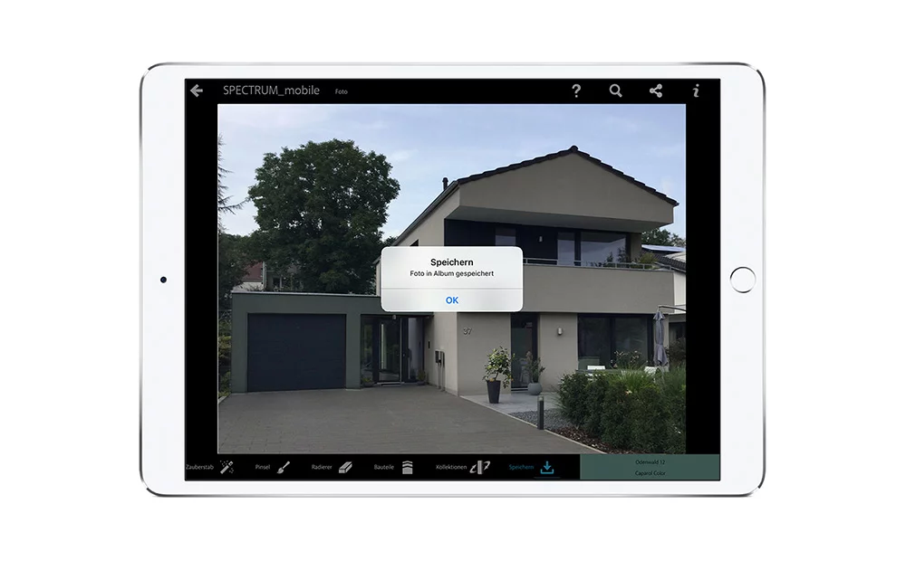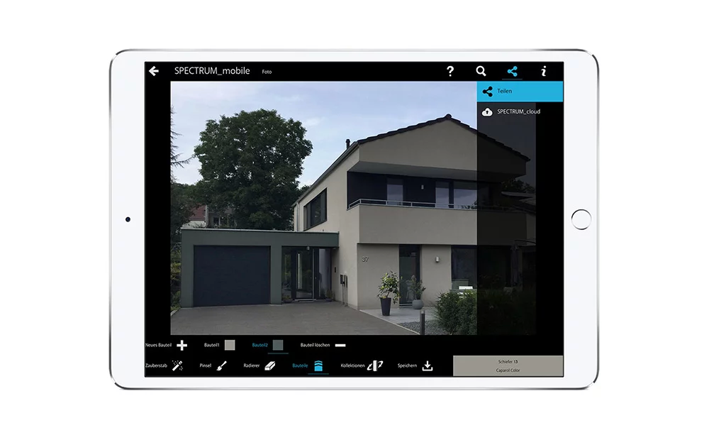 In „Foto“ findet man auch eine Auswahl von Fassaden und Innenräumen, die schnell mit wenigen Fingertaps eingefärbt werden können. Das funktioniert natürlich auch mit dem eigenen Foto.